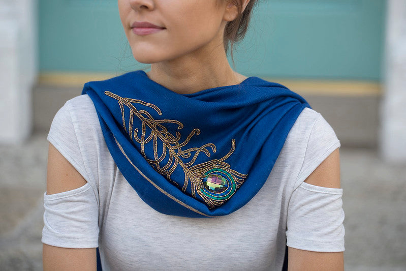 This scarf has been lovingly hand-made in India by skilled Indian artisans, made from a fine weave blend of cashmere and modal, hand-dyed, with an intricate, gold embroidered feather, finished with a beaded glass crystal, and a fine gold weave trim.