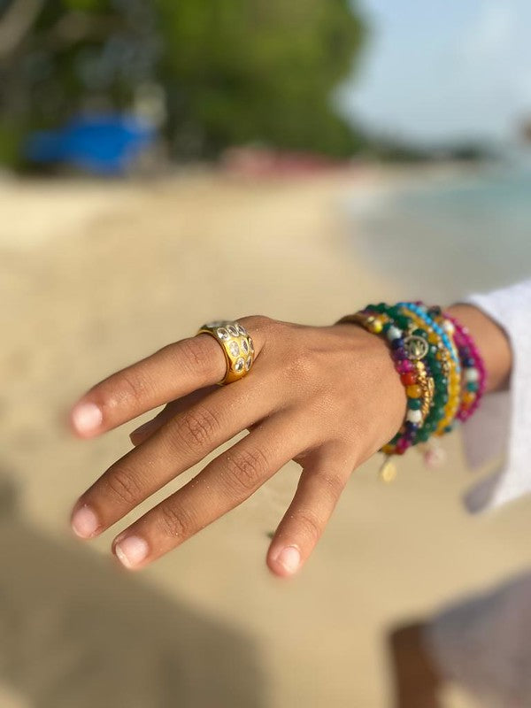 This ring has been lovingly hand-made in India by skilled Indian artisans. It is hand-finished, made with 925 premium sterling silver with semi-precious stones and 18k yellow gold plating.