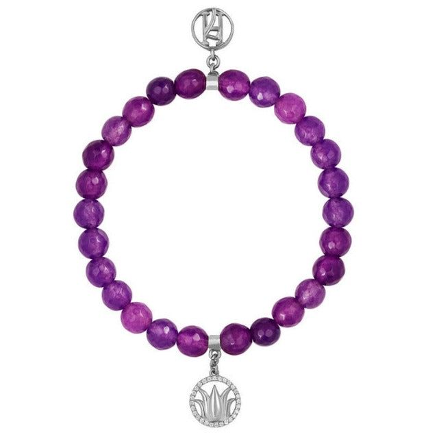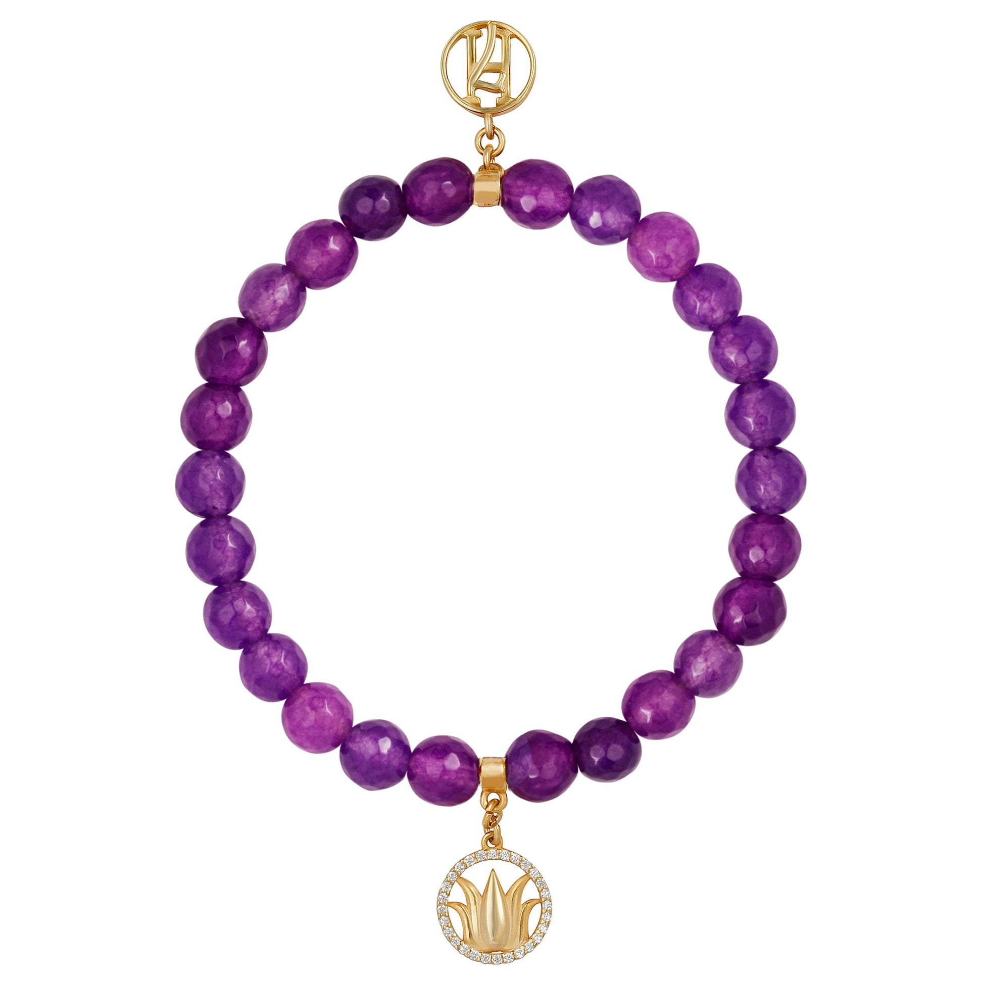 This 925 silver and 18kt gold plated Lotus charm and bead bracelet have been lovingly hand-made using natural enhanced amethyst stones.