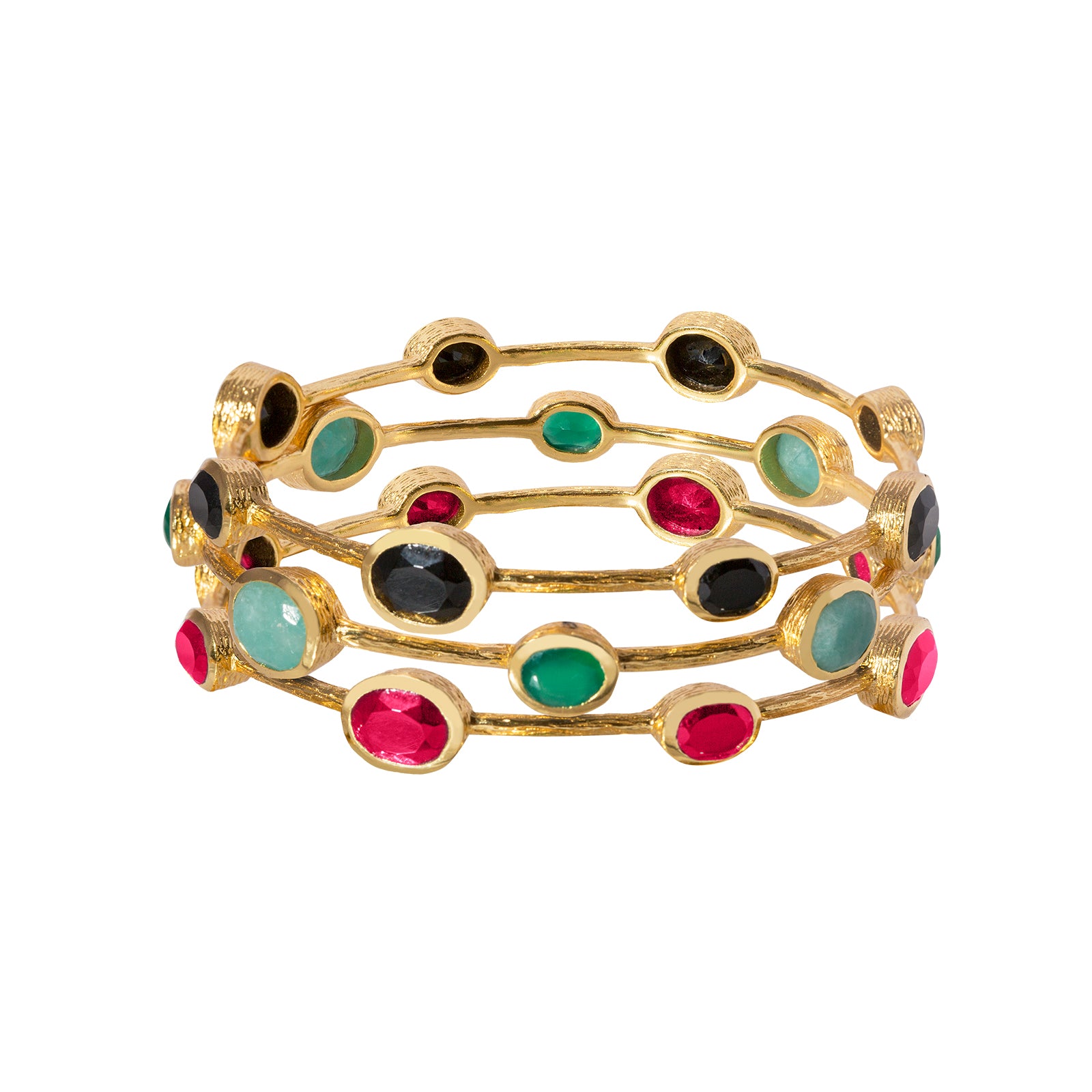 This bangle has been lovingly hand-made in India by skilled Indian artisans. It is hand-finished, made of Brass with natural Gemstones and 18k yellow real gold plating.
