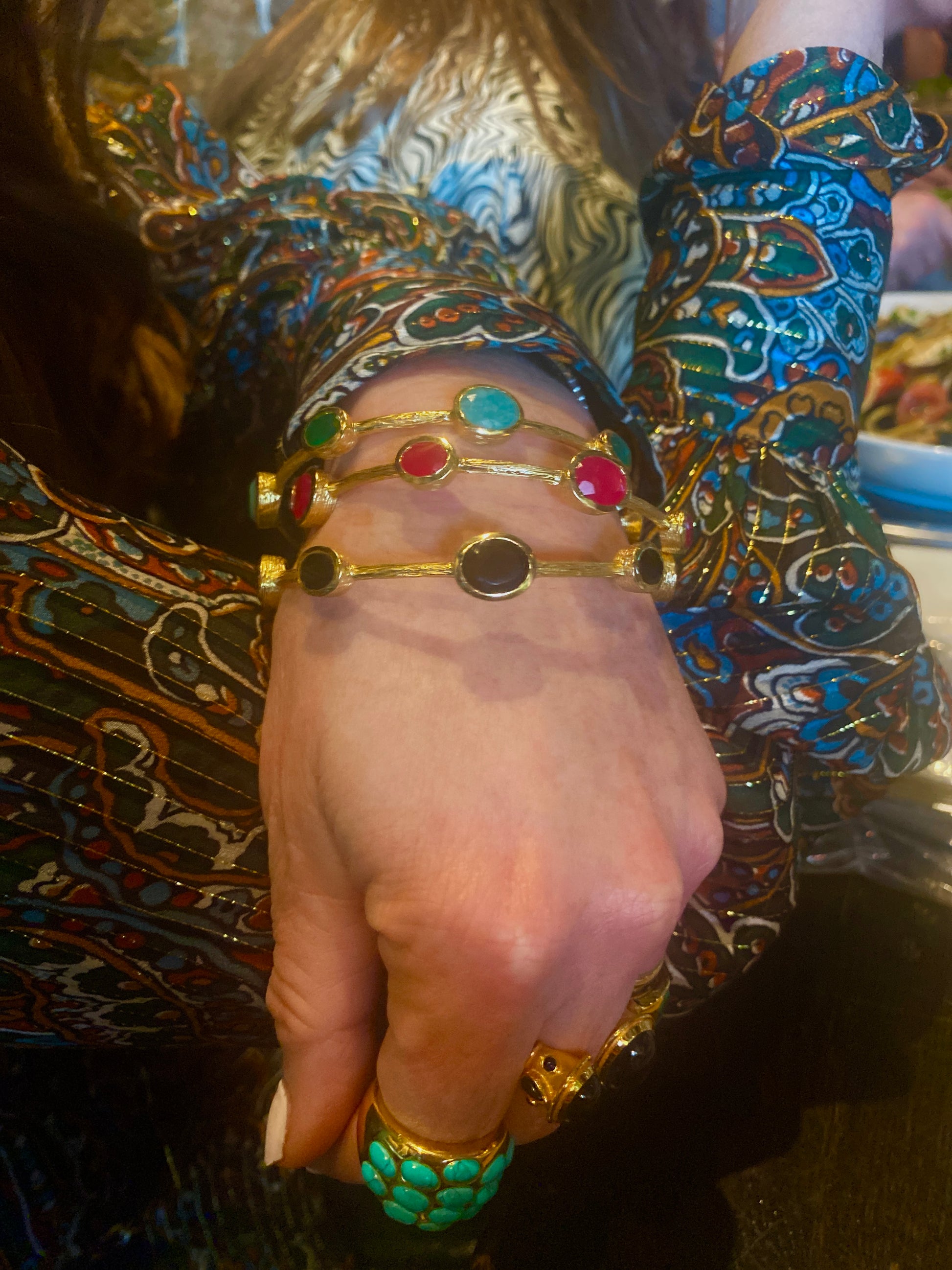 This bangle has been lovingly hand-made in India by skilled Indian artisans. It is hand-finished, made of Brass with natural Gemstones and 18k yellow real gold plating.