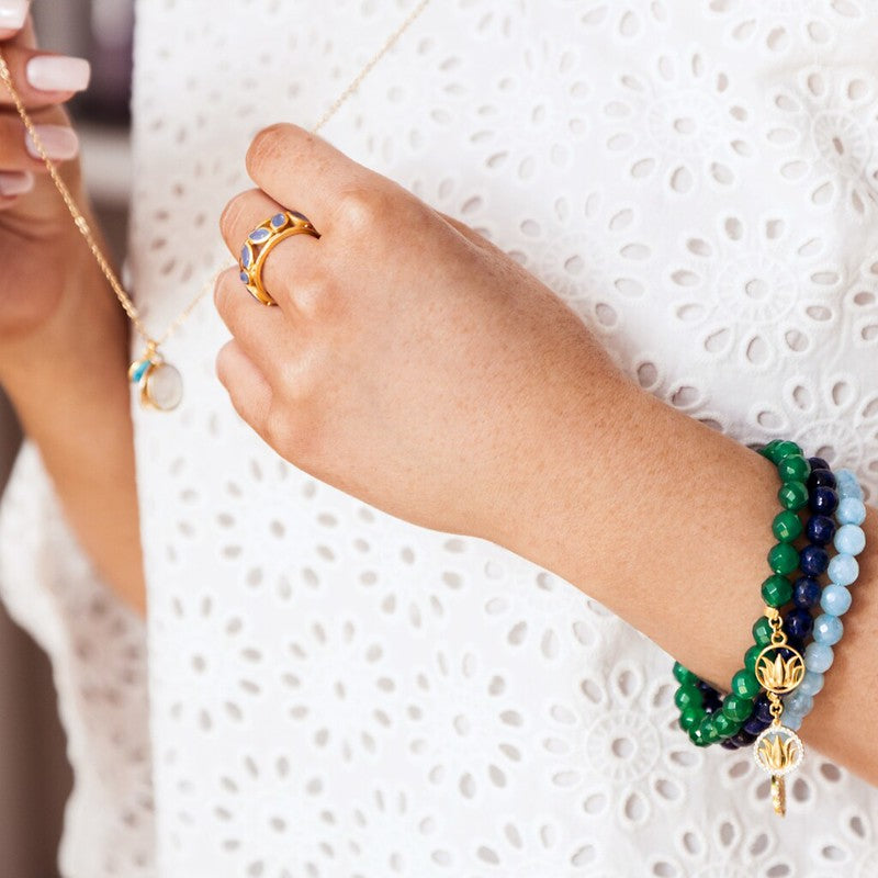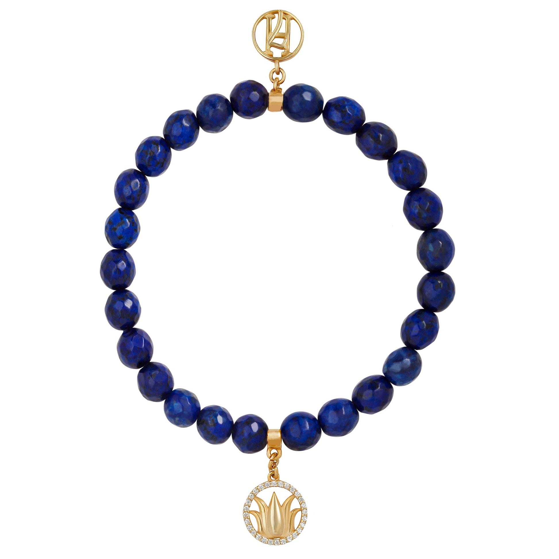 This 925 silver and 18kt gold plated Lotus charm and bead bracelet have been lovingly hand-made using natural blue lapis stones.